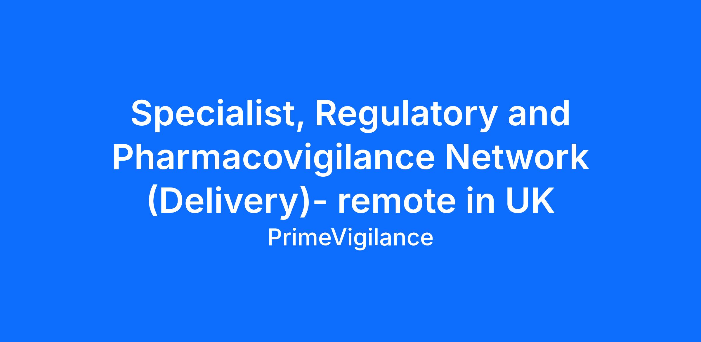The Specialist, Regulatory and PV Network (Delivery) is responsible for providing the strategy based on regulatory requirements and for completing regulatory and PV deliverables based on an established PV and regulatory plan. They also serve as a liaison between regulatory and other functional areas including external partners, clients, authorities and/or consultants in the planning, organizing, and preparing of regulatory deliverables following project, corporate and industry regulatory strategies.